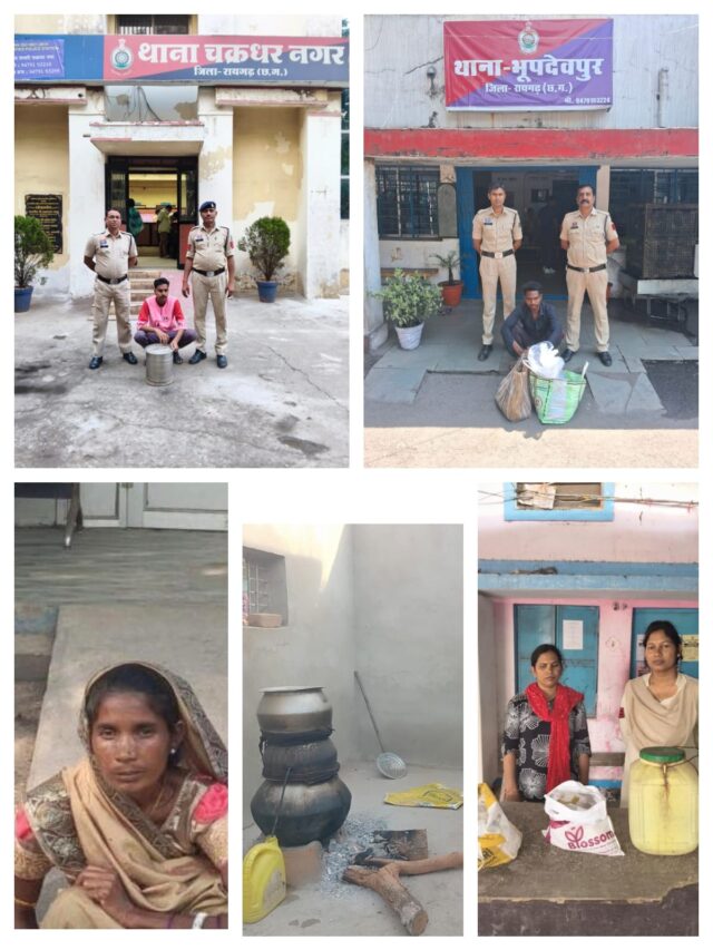 रायगढ़। एसएसपी श्री शशि मोहन सिंह के दिशा निर्देशन पर जिले में अवैध शराब के विरुद्ध चलाए जा रहे “ऑपरेशन आघात” के तहत पुलिस द्वारा लगातार प्रभावी कार्रवाई की जा रही है। इसी कड़ी में दिनांक 16 एवं 17 अप्रैल 2026 को भूपदेवपुर, चक्रधरनगर, छाल, जोबी एवं जूटमिल क्षेत्र में पुलिस टीमों द्वारा अलग-अलग स्थानों पर रेड कार्रवाई करते हुए कुल 62 लीटर से अधिक कच्ची महुआ शराब जब्त कर 5 आरोपियों को गिरफ्तार कर न्यायिक कार्रवाई की गई है।