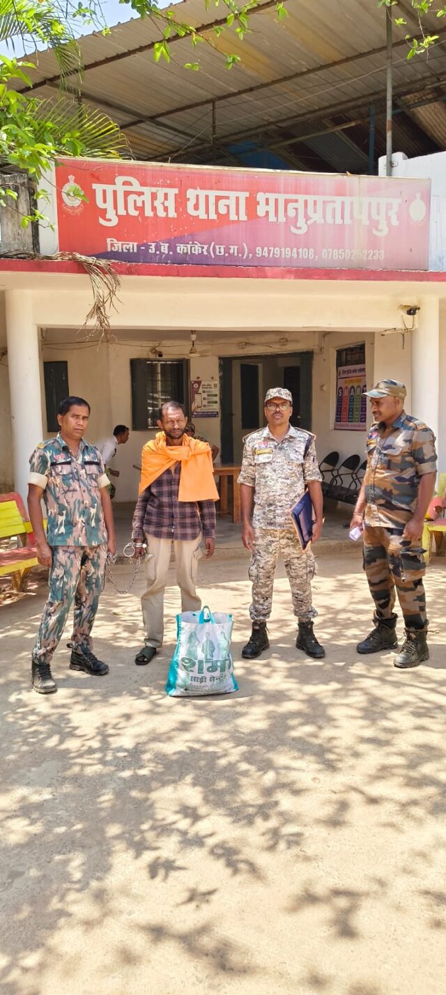 🔸घटना का संक्षिप्त विवरणः- पुलिस अधीक्षक कांकेर निखिल अशोक कुमार राखेचा के निर्देशन में, अतिरिक्त पुलिस अधीक्षक भानुप्रतापपुर श्री आकाश श्रीश्रीमाल के मार्गदर्शन में अनुविभागीय अधिकारी पुलिस श्री शेर बहादुर सिंह ठाकुर भानुप्रतापपुर के पर्यवेक्षण में दिनांक 10.04.2026 को मुखबीर सूचना प्राप्त होते ही भानुप्रतापपुर पुलिस द्वारा घटना स्थल ग्राम बंधियापारा शाहकट्टा आरोपी द्वारा किलो ग्राम 2.170 ग्राम मादक पदार्थ गांजा अवैध रूप से रखकर बिक्री करने हेतु ग्राहक तलाश करते हुए रंगे हाथो पकड़ा गया तत्पश्चात पुलिस द्वारा त्वरित कार्यवाही करते हुए थाना भानुप्रतापपुर में अपराध क्र. 77/2026 धारा 20(b)NDPS ACT के तहत अपराध पंजीबद्ध कर विवेचना में लिया जाकर अभियुक्त को माननीय न्यायालय के समक्ष पेश कर न्यायिक रिमांड में जेल भेजा गया।