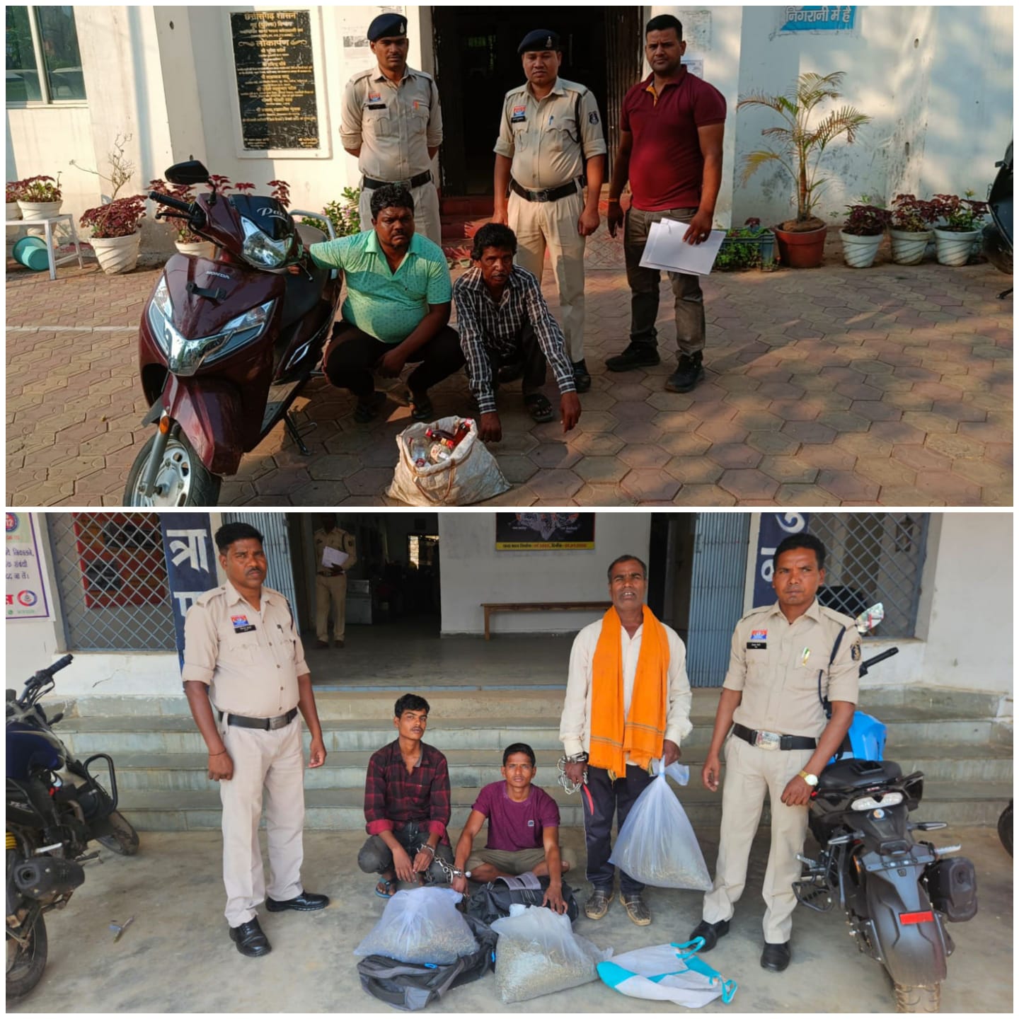 कल दिनांक 06.04.2026 को थाना लैलूंगा पुलिस को मुखबिर से सूचना प्राप्त हुई कि ग्राम सिहारधार मेन रोड किनारे कुछ व्यक्ति अवैध रूप से गांजा रखकर बिक्री हेतु ग्राहक का इंतजार कर रहे हैं। सूचना पर थाना प्रभारी लैलूंगा उप निरीक्षक गिरधारी साव द्वारा वरिष्ठ अधिकारियों को अवगत कराते हुए पुलिस टीम के साथ मौके पर पहुंचकर घेराबंदी की गई। मौके पर तीन संदिग्ध व्यक्ति बैग व थैला लिए खड़े मिले, जिन्हें पकड़कर पूछताछ करने पर उन्होंने अपना नाम (1) दिलेश्वर यादव पिता लच्छी राम यादव उम्र 19 वर्ष, (2) पिण्टू यादव पिता गोमदो यादव उम्र 18 वर्ष एवं (3) गोमदो यादव पिता स्व. शोभाराम यादव उम्र 54 वर्ष, सभी निवासी ग्राम सिहारधार थाना लैलूंगा जिला रायगढ़ बताया।