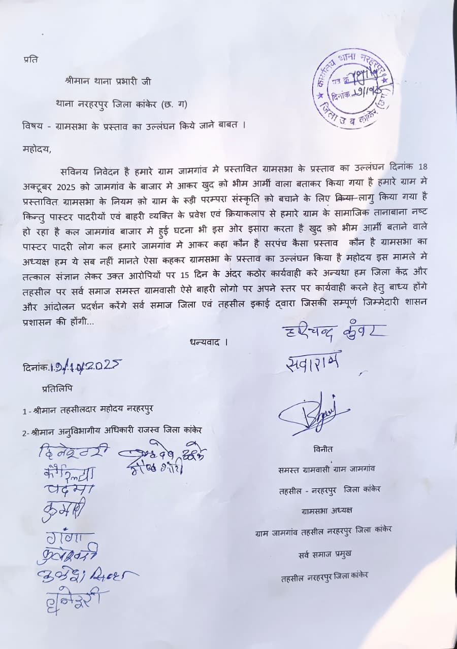 नरहरपुर/कांकेर जिले के नरहरपुर विकासखंड अंतर्गत ग्राम जामगांव में धर्मांतरण के मुद्दे को लेकर उपजा विवाद अब तूल पकड़ता जा रहा है। ग्राम निवासी हिमांशु तिवारी और गौरव शोरी ने प्रशासन पर उन्हें झूठे मामलों में फंसाने और मानसिक रूप से प्रताड़ित करने का गंभीर आरोप लगाया है। उनका कहना है कि जब घटना के वक्त स्वयं पुलिस प्रशासन वहां मौजूद था, तो उन पर शांति भंग का आरोप लगाना पूरी तरह निराधार है।