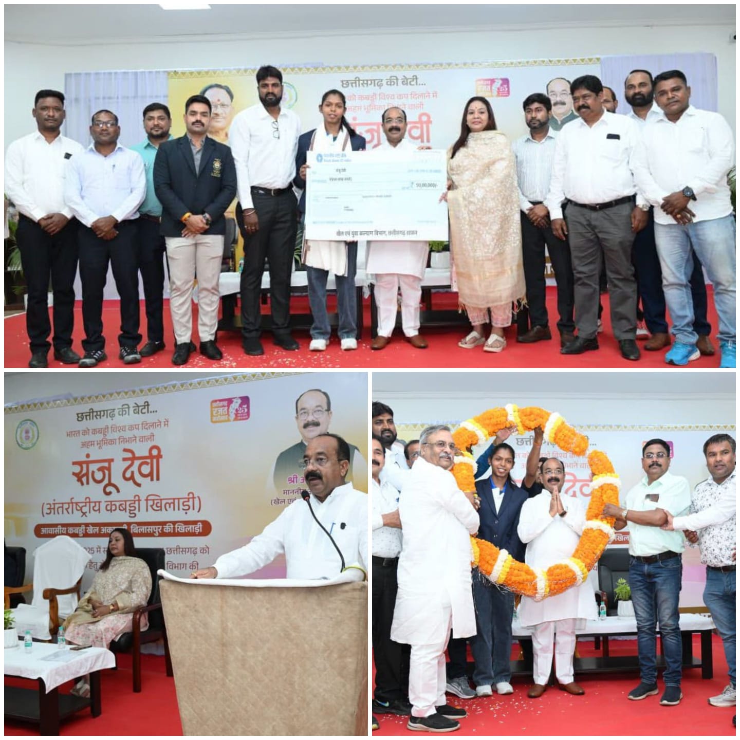 रायपुर. भारत को कबड्डी विश्वकप और एशियन चैंपियनशिप दिलाने में अहम भूमिका निभाने वाली संजू देवी को राज्य शासन के खेल एवं युवा कल्याण विभाग द्वारा 50 लाख रुपए की प्रोत्साहन राशि प्रदान की गई है। छत्तीसगढ़ में पहली बार किसी खिलाड़ी को इतनी बड़ी प्रोत्साहन राशि दी गई है। उप मुख्यमंत्री तथा खेल एवं युवा कल्याण मंत्री श्री अरुण साव ने आज नवा रायपुर स्थित अपने निवास कार्यालय में आयोजित सम्मान समारोह में उन्हें यह राशि सौंपी। श्री साव ने इस दौरान बिलासपुर के चिंगराजपारा कबड्डी क्लब को कबड्डी मैट भी प्रदान किया।