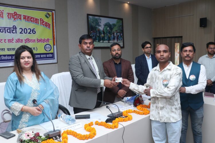 राष्ट्रीय मतदाता दिवस के अवसर पर नए मतदाता मांझापारा कांकेर निवासी भूषण कुमार केशरवानी एवं संयम चोपड़ा, जवाहर वार्ड के यशोदा यादव, माहुरबंदपारा के मोनिका धनेलिया एवं पार्वती सलाम और ग्राम कोकपुर के मतदाता रूद्रकांत जैन एवं छगेन्द्र कुमार सिन्हा को मतदाता कार्ड प्रदान किया गया। एसआईआर में उत्कृष्ट कार्य करने वाले बीएलओ अंतागढ़ विधानसभा क्षेत्र से रविदास कवलिया, लोकेश मिश्रा एवं कपिल साहू, भानुप्रतापपुर विधानसभा क्षेत्र से पुरूषोत्तम सोनवंशी, किशोर कुमार साहू, मनोज कुमार देवांगन तथा कांकेर विधानसभा क्षेत्र से निरंजन सिंह ठाकुर, घसिया राम साहू और नंदलाल साहू को 05 हजार रूपए का नगद पुरस्कार एवं प्रशस्ति पत्र से सम्मानित किया गया।