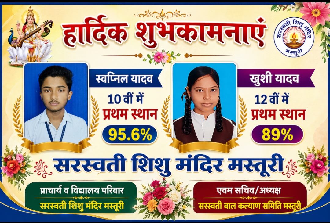 इसी दिन 3=00 बजे 10 वी और 12वी का घोषित परीक्षा परिणाम भी उत्कृष्ट रहा । जिसमें दसवीं कक्षा में 95.6% अंकों के साथ भैया स्वप्निल यादव ने प्रथम स्थान प्राप्त किया वहीं 12 वो कक्षा में बहन खुशी यादव ने 89% अंकों के साथ पहला स्थान प्राप्त किया l