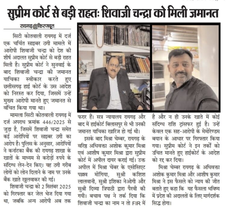 रायगढ़। सिटी कोतवाली रायगढ़ में दर्ज एक चर्चित साइबर ठगी मामले में आरोपी शिवाजी चन्द्रा को देश की शीर्ष अदालत सुप्रीम कोर्ट से बड़ी राहत मिली है। सुप्रीम कोर्ट ने सुनवाई के बाद शिवाजी चन्द्रा की जमानत याचिका स्वीकार करते हुए छत्तीसगढ़ हाई कोर्ट के उस आदेश को निरस्त कर दिया, जिसमें उन्हें मुख्य आरोपी मानते हुए जमानत से वंचित किया गया था।