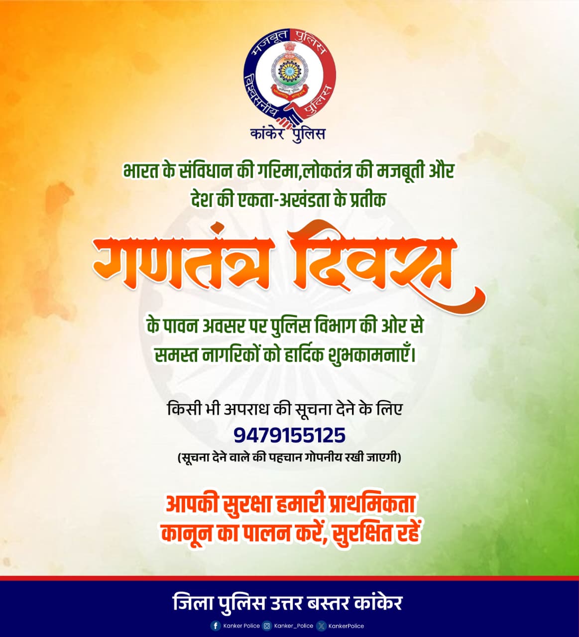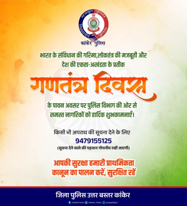 जिला पुलिस प्रशासन- उत्तर बस्तर कांकेर ने 76वें गणतंत्र दिवस के अवसर पर जिलेवासियों को शुभकामनाएं देते हुए शांति और सुरक्षा व्यवस्था बनाए रखने के लिए विशेष दिशा-निर्देश जारी किए हैं। कांकेर पुलिस नागरिकों से अपील करती है कि वे एक जागरूक नागरिक होने का परिचय दें और समाज में होने वाली किसी भी गलत गतिविधियों व अपराध के खिलाफ सतर्क रहें और तत्काल सूचना दें।