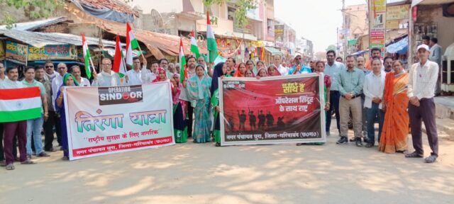 सभी ने हाथ में लिया तिरंगा तिरंगा यात्रा देशभक्ति नारों के साथ आगे बढ़ी। यात्रा का समापन स्वर्ण जयंती चौक, सदर रोड, बजरंग चौक, बस स्टेंड होते हुए नगर पंचायत पर हुआ। यहां सभी जनप्रतिनिधि एवं उपस्थित जनों ने शहीदों को श्रद्धांजलि अर्पित की। कार्यक्रम में सैकड़ों नगर वासी , समाजसेवी गण शामिल हुए। सभी ने हाथों में तिरंगा लेकर देशभक्ति का परिचय दिया। यह यात्राएं ऑपरेशन सिंदूर की सफलता का जश्न मना रही हैं। इस ऑपरेशन में भारतीय सेना ने बड़ी संख्या में पाकिस्तानी आतंकियों को समाप्त किया था। कार्यक्रम में नगर पंचायत अध्यक्ष श्रीमती लुकेश्वरी थानसिंह निषाद, मुख्य नगर पालिका अधिकारी लालसिंह मरकाम,उपाध्यक्ष समीम खान, सभापति चित्रेखा ध्रुव, भोलेशंकर जायसवाल, रजनी लहरे, बलराज पटेल,गरिमा ध्रुव,पार्षद हरीश यादव, रामजी दीवान, शांतनु देवांगन, देवीसिंह नेताम, मोहम्मद यामीन, पंचराम टंडन, दीप्ति यादव, सलीम मेमन, पूर्व पार्षद रामलाल कुलदीप,मीना चंद्राकर, दुलम बाई, तुलसी राम साहू,वरिष्ठ नागरिक राजू यादव, चम्पेश्वर गिरी गोस्वामी, निखिल साहू,चंद्रहास सोनी, सुनीता चंद्राकर,समारु साहू, विनय गुप्ता, उद्घोषक समाजसेवी शीतल ध्रुव, शिक्षक हीरालाल साहू,गरिमा यादव, रामाधार यादव, वीरेंद्र ठाकुर, जितेंद्र पाटकर, धनेश्वर नाग, मिथलेश सिन्हा,मनोज दुबे,कमलेश सिन्हा,दीपक साहू, शोएब अली,परमेश्वर सिन्हा,मेघराज यादव, स्वच्छता दीदियां एवं नगर के नागरिक गण उपस्थित थे ।