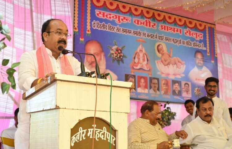 उप मुख्यमंत्री श्री अरुण साव ने संत समागम को सम्बोधित करते हुए कहा कि संत समाज को मार्गदर्शन देते हैं। संत कबीर ने जीवन जीने का आचरण बताया है। उनकी वाणी आज भी प्रासंगिक है। उन्हें मानने वाले पूरे देशभर में हैं। इस आश्रम में कई तरह के अभावों के बीच भी कबीर के विचारों को लोगों तक पहुंचाने में आप लोग लगे हुए हैं। उन्होंने कहा कि आप सभी संत कबीर की वाणी को जन-जन तक पहुंचाकर लोगों को जागरूक कर रहे हैं। देश की तरक्की के लिए समाज का जागरूक होना जरूरी है। आज राज्य की सरकार और केंद्र की सरकार मिलकर लोगों के आर्थिक स्तर को ऊंचा उठाने और हर परिवार को आत्म-निर्भर बनाने का काम रही है। संतों के आशीर्वाद से यह काम भी पूरा होगा।