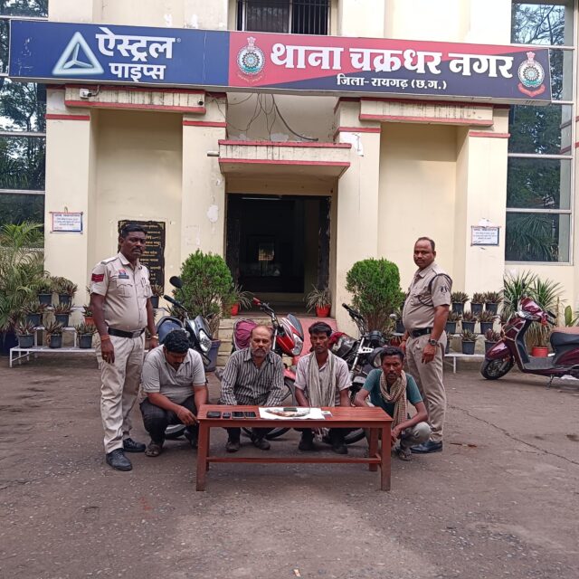 रायगढ़ — चक्रधरनगर पुलिस ने शुक्रवार-शनिवार दरम्यानी रात ग्राम कोलाईबहाल जामगांव स्थित स्कूल मैदान में जुए की फड़ पर दबिश देकर चार आरोपियों को रंगेहाथ गिरफ्तार किया। निरीक्षक अमित शुक्ला के नेतृत्व में की गई इस कार्रवाई में पुलिस ने मौके से नकद रकम, मोबाइल फोन और मोटरसाइकिलें जब्त की हैं। कार्रवाई के दौरान आरोपियों ने पुलिस टीम के समक्ष गवाहों से झगड़ा करने की कोशिश की, जिसके बाद उन्हें प्रतिबंधात्मक धाराओं में गिरफ्तार कर न्यायालय में पेश किया गया।