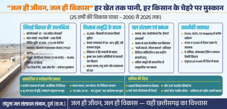 रायपुर / “जल ही जीवन, जल ही विकास” और “हर खेत तक पानी – हर किसान के चेहरे पर मुस्कान” के मूलमंत्र पर चलते हुए, छत्तीसगढ़ राज्य के गठन (वर्ष 2000) के बाद तांदुला जल संसाधन संभाग दुर्ग ने बीते 25 वर्षों में सिंचाई विकास, जल संरक्षण, तकनीकी नवाचार और जनकल्याण के क्षेत्र में ऐतिहासिक उपलब्धियाँ अर्जित की हैं। मुख्यमंत्री श्री विष्णुदेव साय के दूरदर्शी नेतृत्व और राज्य सरकार की कृषक-केंद्रित नीतियों के परिणामस्वरूप, विभाग ने छत्तीसगढ़ को “जल आत्मनिर्भर राज्य” बनाने की दिशा में अभूतपूर्व सफलता प्राप्त की है। विभाग की प्राथमिकताएँ स्पष्ट हैं: जल संसाधनों के माध्यम से ‘जल से जनकल्याण’, सिंचाई सुविधाओं के विस्तार से ‘सिंचाई में समृद्धि’, और आधुनिक कार्यप्रणाली द्वारा ‘तकनीक से पारदर्शिता’ सुनिश्चित करना ही इसका मुख्य ध्येय है।