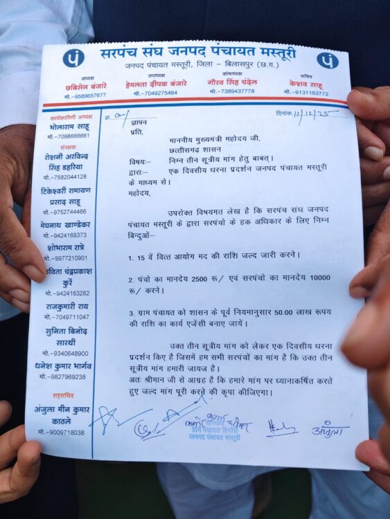 मस्तूरी।जनपद पंचायत मस्तूरी के सरपंच संघ ने अपनी तीन प्रमुख मांगों को लेकर मुख्यमंत्री के नाम से मस्तूरी तहसीलदार को ज्ञापन सौंपा। सरपंच संघ को जिला सदस्य दामोदर कांत ने समर्थन देते हुए उपस्थित रहे । ज्ञात हो कि मस्तूरी क्षेत्र की कुल 132 ग्राम पंचायतों से आए हुए सरपंचों एवं प्रतिनिधि के साथ अध्यक्ष छवि सेन बंजारे, दीपक बंजारे एनल ग्रीतलहरे तथा मीन कुमार ने बताया कि वर्तमान पंचायती कार्यकाल प्रारंभ हुए 9 महीने बीत चुके हैं, लेकिन अब तक पंचायतों को 15वें वित्त आयोग की राशि प्राप्त नहीं हुई है। राशि जारी न होने से ग्रामीण क्षेत्रों में प्रस्तावित विकास कार्य गंभीर रूप से प्रभावित हो रहे हैं। सरपंचों का कहना है कि निधि मिलने पर गांवों में सड़क, नाली, सामुदायिक भवन सहित कई आवश्यक कार्यों को गति मिलेगी, परंतु बजट न मिलने से पंचायतें कार्य हीन स्थिति में हैं। सरपंच संघ ने अपनी दूसरी महत्वपूर्ण मांग में पंचों का मानदेय 2,500 रुपये तथा सरपंचों का मानदेय 10,000 रुपये प्रतिमाह किए जाने की आवश्यकता जताई। प्रतिनिधियों का कहना है कि दायित्व और जिम्मेदारियां बढ़ी हैं, ऐसे में मानदेय वर्तमान परिस्थितियों के अनुरूप होना चाहिए। तीसरी मांग के रूप में पंचायतों को 50 लाख रुपये तक के निर्माण कार्यों के लिए अलग निर्माण एजेंसी का गठन करने की आवश्यकता बताई गई, ताकि पंचायतें बड़े स्तर के विकास कार्यों का निष्पादन स्वयं कर सकें और प्रक्रियाएं सुगम हो सकें। इन तीनों मांगों को लेकर सरपंच संघ ने चेतावनी दी थी कि यदि जल्द निर्णय नहीं लिया गया तो आगामी 11 दिसंबर को मस्तूरी जनपद कार्यालय के सामने एकदिवसीय धरना प्रदर्शन किया जाएगा। उसी के तहत आज मस्तूरी जनपद कार्यालय के सामने टेंट लगाकर धरना प्रदर्शन किए संघ ने स्पष्ट कहा कि यदि इसके बाद भी शासन प्रशासन समस्याओं का समाधान नहीं करेंगे तो जिला स्तर पर बड़ा आंदोलन आयोजित किया जाएगा। सरपंचों ने उम्मीद जताई कि शासन उनकी मांगों पर शीघ्र ही सकारात्मक निर्णय लेगा।