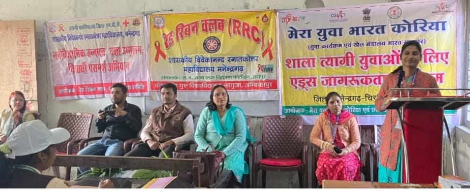 एमसीबी/मनेन्द्रगढ़। रेड रिबन क्लब, शासकीय विवेकानन्द स्नातकोत्तर महाविद्यालय मनेन्द्रगढ़ द्वारा माई भारत कोरिया, जिला युवा अधिकारी एवं छत्तीसगढ़ राज्य एड्स कंट्रोल सोसायटी के संयुक्त तत्वावधान में जिला स्तरीय एड्स जागरूकता कार्यशाला का सफल आयोजन किया गया। यह कार्यक्रम एमसीबी जिला अग्रणी महाविद्यालय में प्रभारी प्राचार्य डॉ. सरोजबाला श्याग विश्नोई के मार्गदर्शन एवं रेड रिबन क्लब प्रभारी के संयोजन में सम्पन्न हुआ।