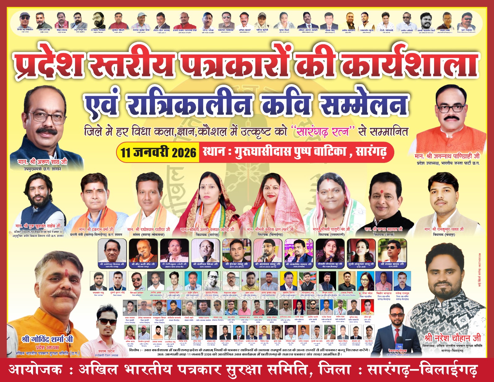सारंगढ़–बिलाईगढ़ जिले के इतिहास में 11 जनवरी का दिन एक नई पहचान गढ़ने जा रहा है। जिले के प्रतिष्ठित गुरु घासीदास पुष्पबाटिका परिसर में आयोजित होने वाली प्रदेश स्तरीय पत्रकार कार्यशाला, भव्य रात्रिकालीन कवि सम्मेलन एवं “सारंगढ़ रत्न” सम्मान समारोह न केवल पत्रकारिता और साहित्य का उत्सव बनेगा, बल्कि समाज के विभिन्न क्षेत्रों में उत्कृष्ट योगदान देने वाले व्यक्तित्वों के सम्मान का ऐतिहासिक मंच भी साबित होगा। आयोजन को लेकर पूरे जिले और आसपास के क्षेत्रों में अभूतपूर्व उत्साह एवं ऊर्जा का माहौल है।