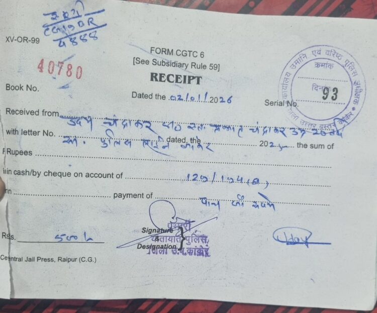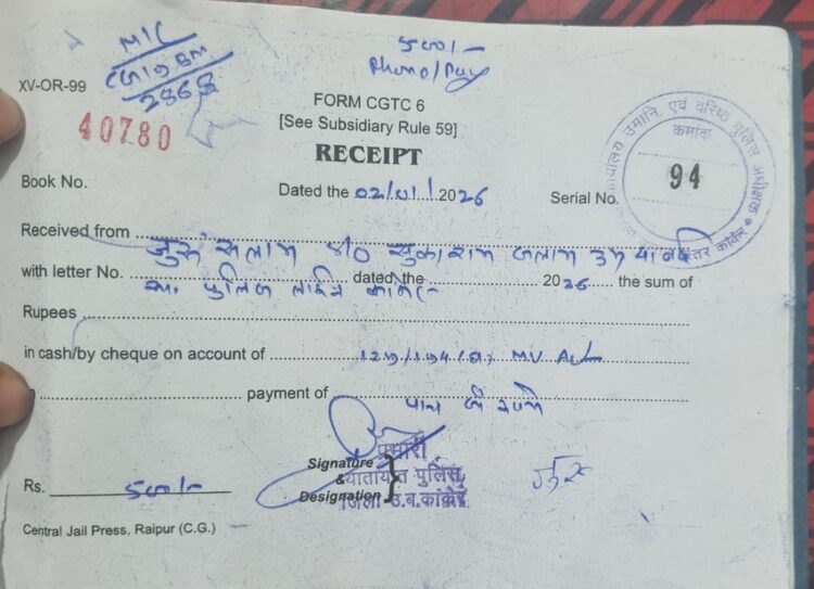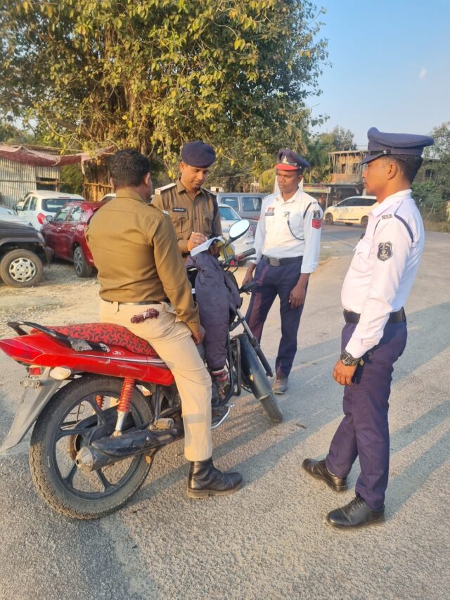 आज दिनांक 02.01.2026 को श्री निखिल राखेचा पुलिस अधीक्षक कांकेर के निर्देशानुसार, आकाश श्री श्रीमाल, अतिरिक्त पुलिस अधीक्षक भानुप्रतापपुर के मार्गदर्शन में, श्री दीपक साव, रक्षित निरीक्षक यातायात प्रभारी कांकेर व यातायात बल कांकेर के द्वारा श्रीमान पुलिस अधीक्षक महोदय के पूर्व आदेश के पालन में थाना के सामने MCP लगाकर बिना हेलमेट के मोटर सायकल चलाने वाले 02 पुलिस कर्मचारियों का चालान किया गया। 01. आरक्षक क्रमांक 590 उदय चन्द्राकर पिता श्री स्व० प्रभात चन्द्राकर, सा० पुलिस लाईन कांकेर, 02. आरक्षक क्रमांक 470 जुरू सलाम पिता सुकाराम सलाम सा० पुलिस लाईन कांकेर का M. V. act. के तहत धारा 129/194(D) पर 500-500 रूपये का चालान काटा गया।
