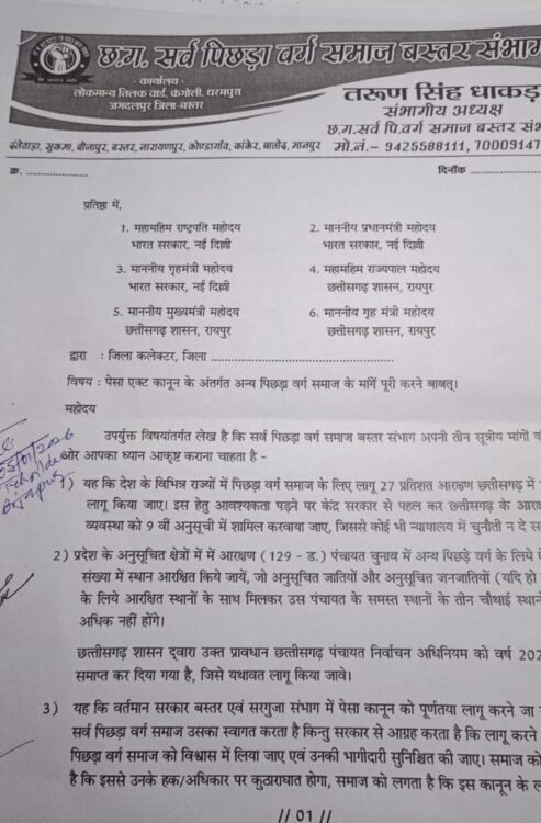 ज्ञापन में समाज की ओर से तीन प्रमुख मांगें रखी गईं। पहली मांग के तहत छत्तीसगढ़ में अन्य पिछड़ा वर्ग के लिए 27 प्रतिशत आरक्षण को प्रभावी रूप से लागू करने तथा आवश्यकता पड़ने पर राज्य की आरक्षण व्यवस्था को संविधान की 9वीं अनुसूची में शामिल करने की मांग की गई, ताकि इसे न्यायिक चुनौतियों से सुरक्षित रखा जा सके। दूसरी मांग में अनुसूचित क्षेत्रों में पंचायत चुनाव के दौरान ओबीसी समाज को जनसंख्या के अनुपात में आरक्षण देने तथा इसे संविधान के प्रावधानों के अनुरूप सुनिश्चित करने की बात कही गई। तीसरी मांग में बस्तर एवं सरगुजा संभाग में पेसा कानून को पूरी पारदर्शिता, विश्वास और सभी वर्गों की सहभागिता के साथ लागू करने की मांग की गई। समाज का कहना है कि ओबीसी समाज को विश्वास में लिए बिना पेसा कानून लागू होने से उनके अधिकारों पर प्रतिकूल प्रभाव पड़ सकता है।