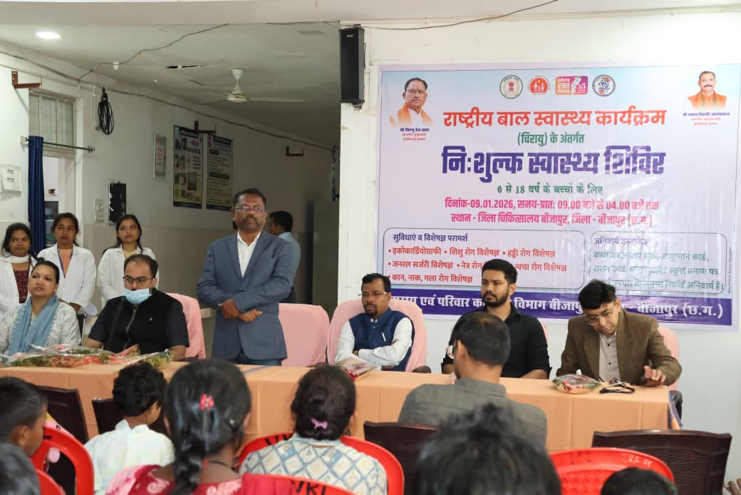 बीजापुर@रामचन्द्रम एरोला – जिला प्रशासन बीजापुर द्वारा कलेक्टर संबित मिश्रा के निर्देशानुसार तथा मुख्य चिकित्सा एवं स्वास्थ्य अधिकारी डॉ. बी.आर. पुजारी एवं सिविल सर्जन डॉ. रत्ना ठाकुर के मार्गदर्शन में शुक्रवार को राष्ट्रीय बाल स्वास्थ्य कार्यक्रम (चिरायु) के अंतर्गत 0 से 18 वर्ष आयु वर्ग के बच्चों के लिए एकदिवसीय विशेष निःशुल्क स्वास्थ्य शिविर का आयोजन जिला चिकित्सालय परिसर, बीजापुर में किया गया। शिविर में बालाजी हॉस्पिटल, रायपुर की विशेषज्ञ टीम द्वारा सेवाएँ दी गईं, जिसमें कार्डियोलॉजिस्ट, अनुभवी जनरल सर्जन, चर्म रोग विशेषज्ञ एवं शिशु रोग विशेषज्ञ शामिल रहे। इसके साथ ही जिला चिकित्सालय बीजापुर के नाक-कान-गला, नेत्र एवं अस्थि रोग विशेषज्ञों द्वारा भी परामर्श एवं उपचार किया गया। जिले के चारों विकासखंडों से चिरायु टीम द्वारा बच्चों को शिविर में लाया गया। शिविर के दौरान कुल 113 बच्चों का स्वास्थ्य परीक्षण एवं उपचार किया गया। इनमें जन्मजात हृदय रोग के 36, कटे होंठ एवं तालू के 10, टेढ़े-मेढ़े पैर के 3, हर्निया के 24, जन्मजात मोतियाबिंद के 2, चर्म रोग के 6, कान रोग के 8 तथा अन्य बीमारियों से पीड़ित बच्चे शामिल थे। इनमें से 75 सर्जिकल केस बच्चों को रायपुर रेफर किया गया, जहाँ उनका निःशुल्क उपचार आयुष्मान भारत – प्रधानमंत्री जन आरोग्य योजना (PM-JAY) के अंतर्गत किया जाएगा। शेष बच्चों को जिला अस्पताल से निःशुल्क दवाइयाँ प्रदान की गईं। इसके साथ ही एक बच्चे को कान की मशीन उपलब्ध कराई गई तथा 37 हितग्राहियों के आयुष्मान कार्ड बनाए गए। रायपुर रेफर किए गए सभी बच्चों के निःशुल्क उपचार की व्यवस्था शासन द्वारा सुनिश्चित की गई है। शिविर के सफल आयोजन में जिला कार्यक्रम प्रबंधक वरुण साहू, डॉ. सजल बाफना, डॉ. चंद्रशेखर सहित समस्त चिकित्सकों, नर्सिंग स्टाफ एवं स्वास्थ्य कर्मियों का महत्वपूर्ण योगदान रहा। शिविर का अवलोकन करते हुए संयुक्त कलेक्टर जागेश्वर कौशल ने आवश्यक मार्गदर्शन दिया।