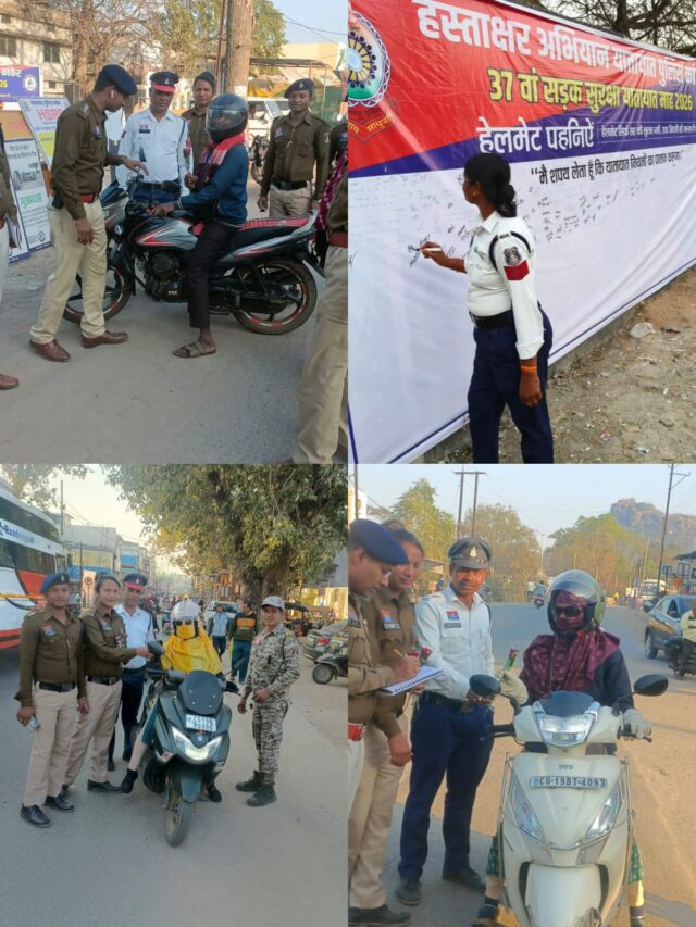 37 वॉ सड़क सुरक्षा-माह 2026 के क्रम में आज दिनांक 12.01.2026 को श्री निखिल राखेचा पुलिस अधीक्षक कांकेर के निर्देशानुसार, आकाश श्रीश्री माल, अतिरिक्त पुलिस अधीक्षक भानुप्रतापपुर तथा श्री दिनेश सिन्हा, अतिरिक्त पुलिस कांकेर के मार्गदर्शन में, श्री दीपक साव, रक्षित निरीक्षक यातायात प्रभारी कांकेर व यातायात बल कांकेर के द्वारा कांकेर इकाई अंतर्गत मोटर सायकलों से अत्याधिक सड़क दुघर्टनाओं को देखते हुये आज दिनांक 12.01.2026 को हेलमेट धारण कर वाहन चालन करने व यातायात नियमों के संबंध में समझाईश देकर जागरूक किया गया। तत् संबंध में शाम 04:00 बजे थाना के सामने हेलमेट धारण करने वाले मोटर सायकल चालकों को गुलांब फूल देकर सम्मानित किया गया। इस दौरान हेलमेट धारण नही करने वाले मोटर सायकल चालकों को यातायात नियमों के बारे में समझाईश देकर हस्ताक्षर अभियान के तहत ” में यातायात नियमों का पालन करूंगा शपत दिलाकर हस्ताक्षर करवाया गया। इस अवसर पर लगभग 200-300 ग्रामीण एवं शहरी लोग लाभान्वित हुये। कार्यक्रम स्थल में लाउड स्पीकर से यातायात नियमों का प्रचार-प्रसार व हेलमेट पहनने संबंधी जानकारी दिया गया।