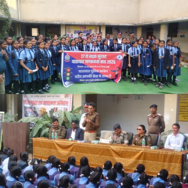आज दिनांक 14.01.2026 को श्री निखिल राखेचा पुलिस अधीक्षक कांकेर के निर्देशानुसार, श्री दिनेश कुमार सिन्हा अतिरिक्त पुलिस अधीक्षक कांकेर के मार्गदर्शन में, श्री अविनाश ठाकुर उप पुलिस अधीक्षक कांकेर,डॉ. मेखलेन्द्र प्रताप सिंह उप पुलिस अधीक्षक कांकेर नोडल अधिकारी यातायात, सुश्री प्रतिभा लहरे उप पुलिस अधीक्षक महिला एवं रक्षा टीम व यातायात कांकेर व थाना प्रभारी नरहरपुर सोमेश सिंह बघेल व थाना स्टॉफ के द्वारा आत्मानंद स्कूल नरहरपुर में जाकर स्कूली बच्चों साइबर सुरक्षा से संबधित जागरूकता,यातायात संबंधी जानकारी दी गई, बच्चों व शिक्षको को यातायात नियम पालन करने हेतु शपथ दिलवाई गई | बच्चों को पोस्टर पॉम्पलेट वितरण किया गया साथ ही बच्चे पुलिस के साथ मिलकर यातायात जागरूकता संबंधी पोस्टर स्कूल की दीवार व चौक चौराहो में लगाया गया तथा बच्चों को गुड टच बैड टच व महिला एवं बच्चों से सम्बंधित अपराधों के बारे में बताकर सतर्क किया गया इस दौरान आत्मानंद स्कूल के प्राचार्य श्री एन के साहू, पार्षद श्री मुकेश संचेती नरहरपुर व शहर के अन्य स्कूलों के बच्चे व शिक्षक लगभग 800 लाभान्वित हुए.