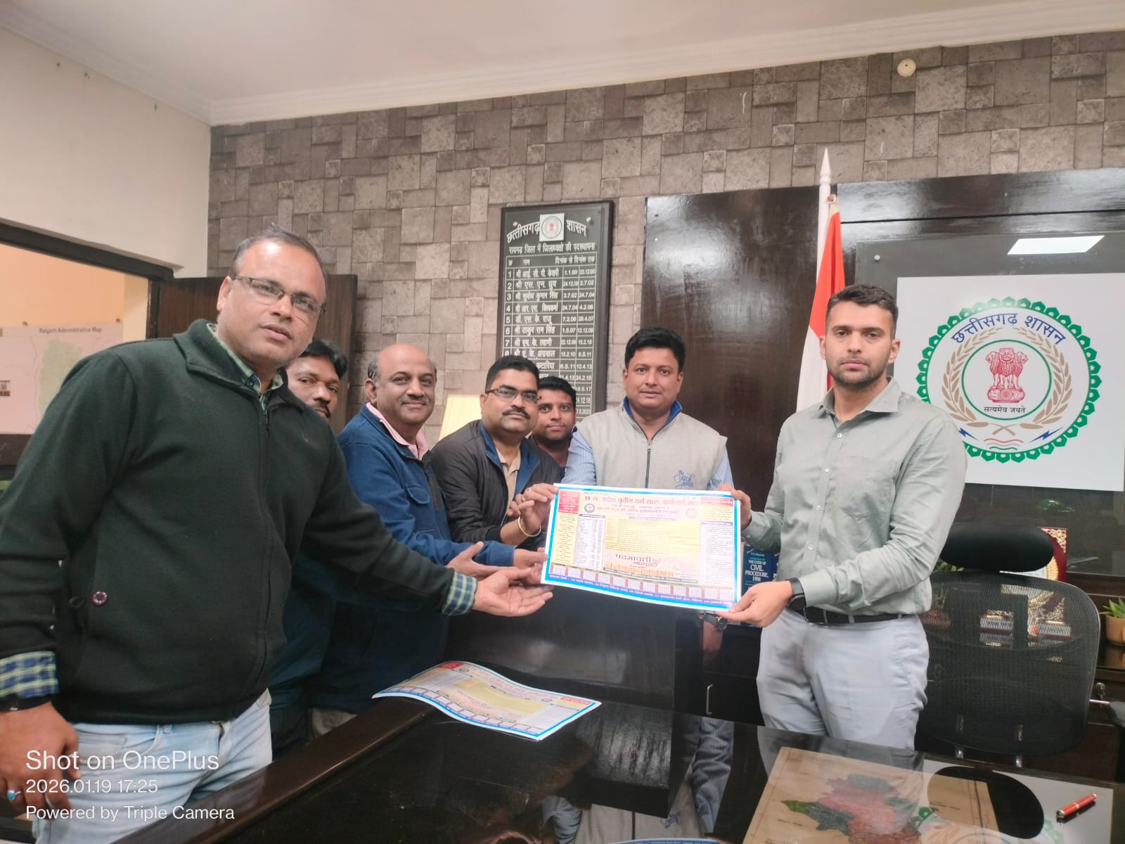 रायगढ़।छत्तीसगढ़ प्रदेश तृतीय वर्ग शासकीय कर्मचारी संघ द्वारा आज रायगढ़ कलेक्टर मयंक चतुर्वेदी से सौजन्य मुलाकात कर संघ का वार्षिक कैलेंडर भेंट किया गया। इस अवसर पर संघ की ओर से कर्मचारियों के हित में किए जा रहे निरंतर प्रयासों की जानकारी देते हुए कलेक्टर महोदय के प्रति आभार व्यक्त किया गया।इस गरिमामयी अवसर पर संघ के कार्य जिलाध्यक्ष संजीव सेठी, जिला सचिव बी.एल.एस. जटवार, सुखदेव सिधार, जिला उपाध्यक्ष विकास सिन्हा, तहसील अध्यक्ष विकास तिवारी, आईटीआई संघ अध्यक्ष अनिल डनसेना एवं तहसील सचिव दीपक सिंह की उपस्थिति रही।उल्लेखनीय है कि हाल ही में संघ के कैलेंडर का विधिवत विमोचन किया गया था। इसके पश्चात आज कलेक्ट्रेट सहित जिले की समस्त शाखाओं, विभिन्न विभागों एवं सभी विद्यालयों में कैलेंडर का व्यापक वितरण किया गया। इस संपूर्ण कार्यक्रम का नेतृत्व संजीव सेठी द्वारा किया गया।