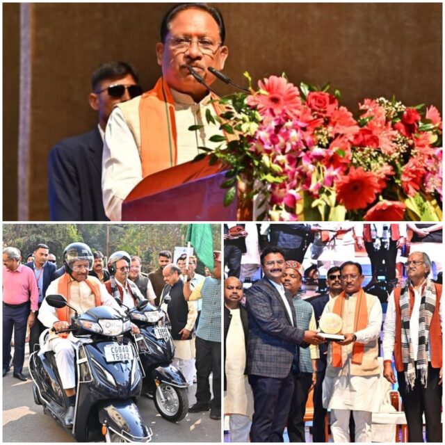 मुख्यमंत्री श्री साय ने सड़क सुरक्षा का संदेश देते हुए स्वयं हेलमेट पहनकर बाइक चालकों के दल के साथ स्कूटी चलाई।कार्यक्रम में मुख्यमंत्री श्री साय ने राजधानी रायपुर के पंडरी में आधुनिक लाइसेंस सेंटर कार्यालय भवन पंडरी का भूमिपूजन और प्रदेश भर में मुख्यमंत्री ग्रामीण बस योजना के तहत 12 नवीन मार्गों में 12 नवीन बसों का शुभारंभ किया।