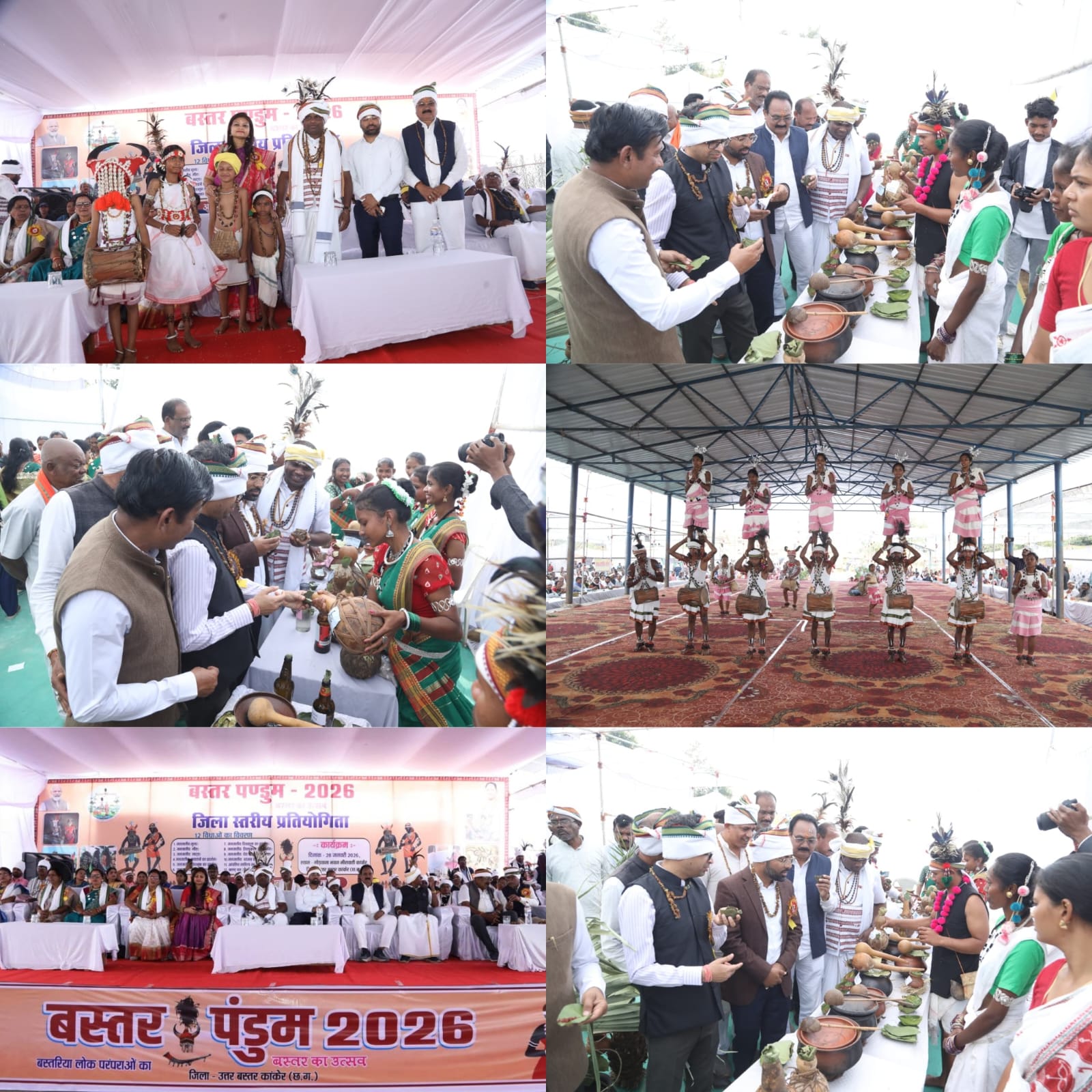 उत्तर बस्तर कांकेर, 28 जनवरी 2026/ बस्तर पंडुम-2026 का जिला स्तरीय एक दिवसीय आयोजन आज जिला मुख्यालय से लगे ग्राम पंचायत भीरावाही के गोंडवाना समाज भवन परिसर में किया गया, जिसमें बस्तर की आदिवासी जनजातियों के पारंपरिक रहन-सहन, खान-पान, वेशभूषा, आभूषण, लोक नृत्य, लोक गीत व प्राचीन सभ्यताओं का प्रदर्शन किया गया। इस दौरान जिले के सातों विकासखण्ड से आए समूहों के द्वारा स्टॉल लगाकर जनजातीय परंपराओं से अवगत कराया गया। इस अवसर पर मुख्य अतिथि के तौर पर कांकेर विधायक श्री आशाराम नेताम उपस्थित रहे।