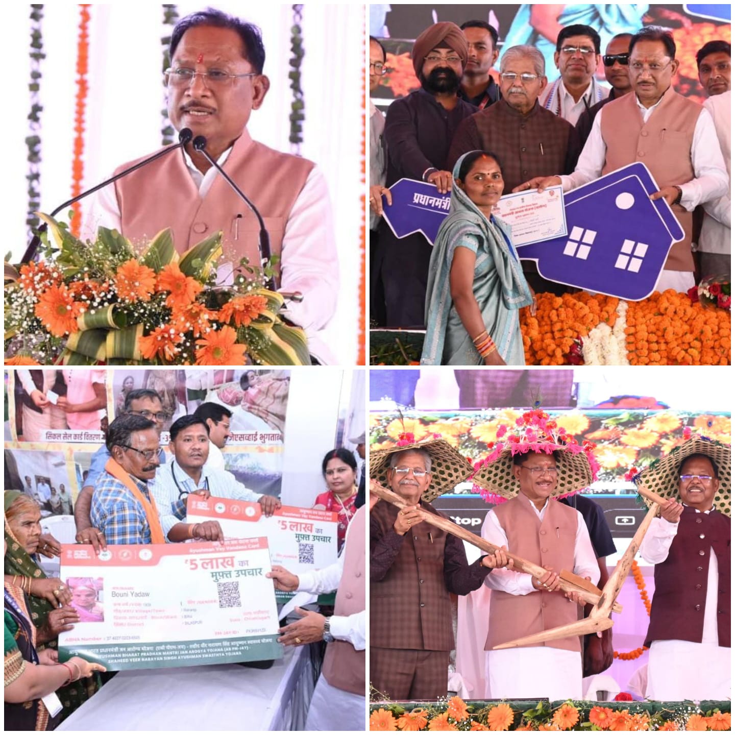मुख्यमंत्री श्री साय ने कहा कि हमारी सरकार ने प्रधानमंत्री श्री नरेंद्र मोदी की सभी गारंटियों को पूरा करने के लिए पूरी तत्परता से कार्य किया है और विगत दो वर्षों के कार्यकाल में अधिकांश वादों को पूरा कर लिया गया है। राज्य में सरकार बनते ही पहली कैबिनेट में प्रधानमंत्री आवास योजना के अंतर्गत 18 लाख गरीब परिवारों को आवास स्वीकृत किए गए। उन्होंने कहा कि राज्य सरकार द्वारा सुशासन एवं अभिसरण विभाग का गठन किया गया है तथा प्रशासन में पारदर्शिता लाने के लिए ई-ऑफिस प्रणाली लागू की गई है। मुख्यमंत्री ने सभी की सहभागिता से विकसित छत्तीसगढ़ बनाने के संकल्प को दोहराया।