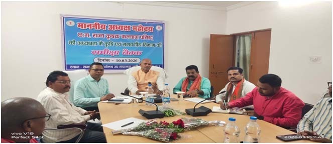 उत्तर बस्तर कांकेर, 10 मार्च 2026/ छत्तीसगढ़ राज्य कृषक कल्याण परिषद् के अध्यक्ष श्री सुरेश कुमार चन्द्रवंशी (राज्यमंत्री दर्जा प्राप्त) की अध्यक्षता में कृषि एवं समवर्गीय विभागों की समीक्षा बैठक कार्यालय उप संचालक कृषि, कांकेर के सभाकक्ष में आज आहूत की गई जिसमें केन्द्र एवं राज्य सरकार द्वारा संचालित विभिन्न योजनाओं के क्रियान्वयन एवं प्रगति के संबंध में समीक्षा की गई। साथ ही समवर्गीय विभागों में संचालित योजनाओं की प्रगति पर चर्चा की गई।