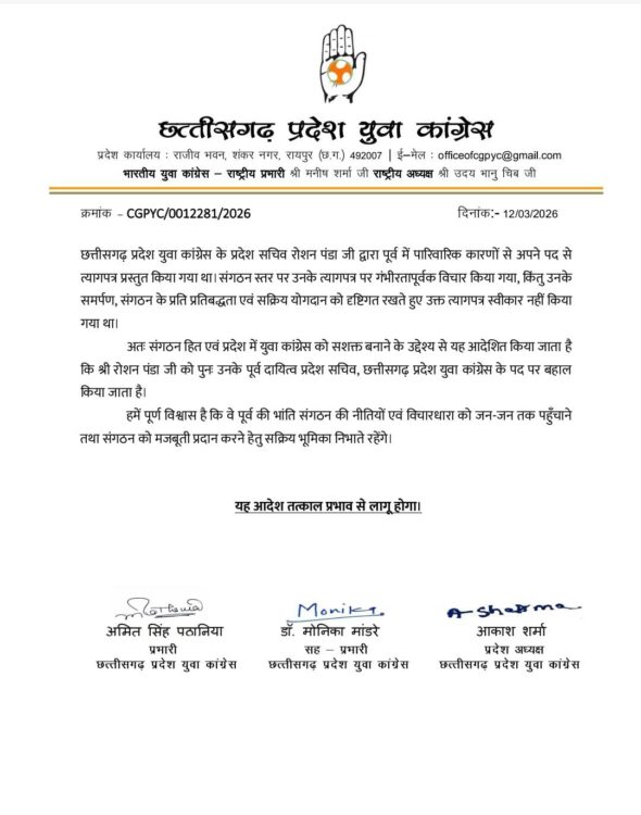 छत्तीसगढ़ प्रदेश युवा कांग्रेस ने संगठनात्मक निर्णय लेते हुए रोशन पंडा को पुनः प्रदेश सचिव के पद पर बहाल कर दिया है। इस संबंध में प्रदेश कार्यालय से आधिकारिक आदेश जारी किया गया है।