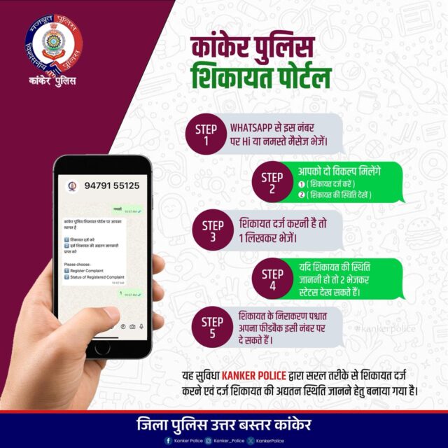 🔶 कांकेर पुलिस ने शुरू किया व्हाट्सएप आधारित शिकायत पोर्टल ।