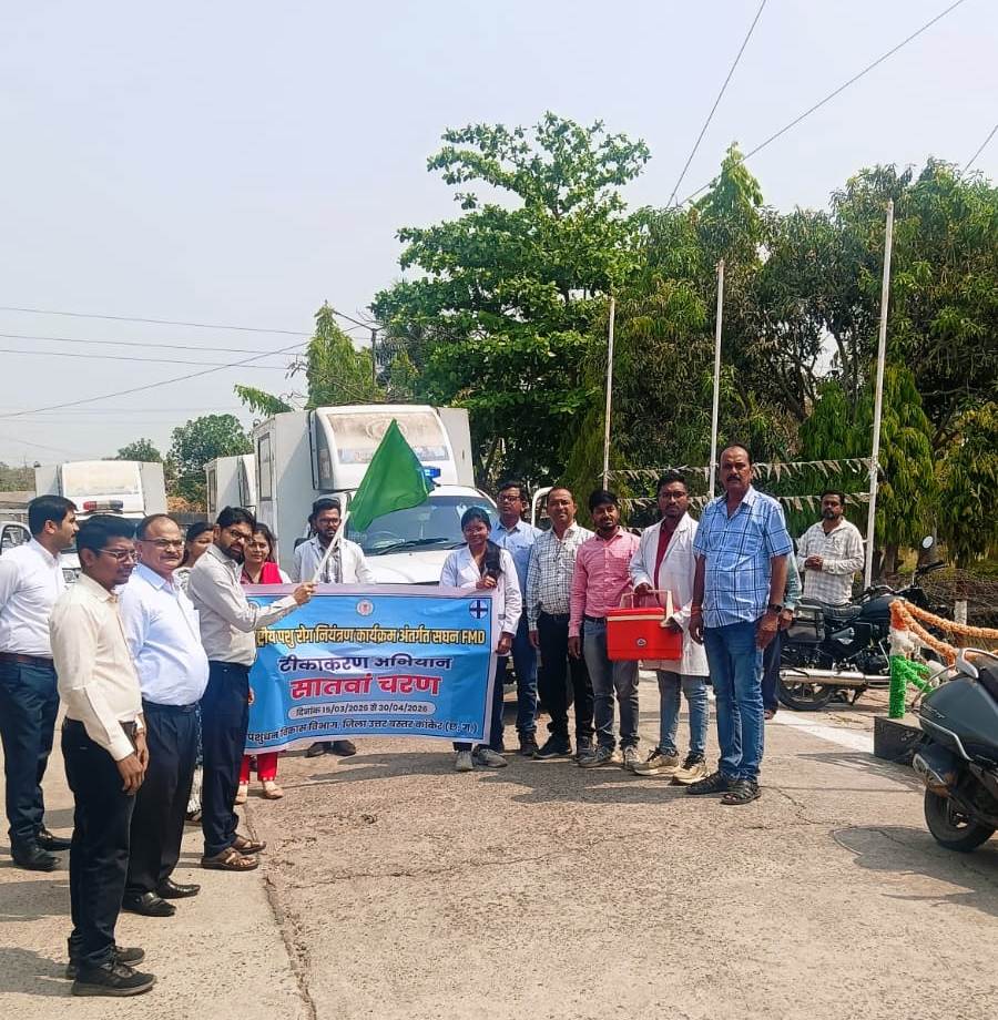 उत्तर बस्तर कांकेर, 16 मार्च 2026/ पशुओं के खुर-पका, मुंह पका रोग से बचाव के लिये विशेष टीकाकरण अभियान की शुरूआत जिले में हो गयी है। यह अभियान केन्द्र सरकार की योजना राष्ट्रीय पशु रोग नियंत्रण कार्यक्रम के तहत चलाया जा रहा है। मुख्य कार्यपालन अधिकारी जिला पंचायत श्री हरेश मंडावी ने जिला पंचायत परिसर से टीकाकरण दल को हरी झंडी दिखाकर अभियान का शुभारंभ किया। यह अभियान 30 अप्रैल तक चलेगा। इस दौरान गाय, भैंस दोनो प्रजातियों के पशुओं का खुर-पका, मुंह-पका रोग से बचाव के लिये टीकाकरण किया जायेगा। इस अभियान के सफल संचालन के लिए 84 टीकाकरण दल का गठन किया गया है, जिनके द्वारा जिले के समस्त ग्रामों में टीकाकरण कार्य किया जाएगा।